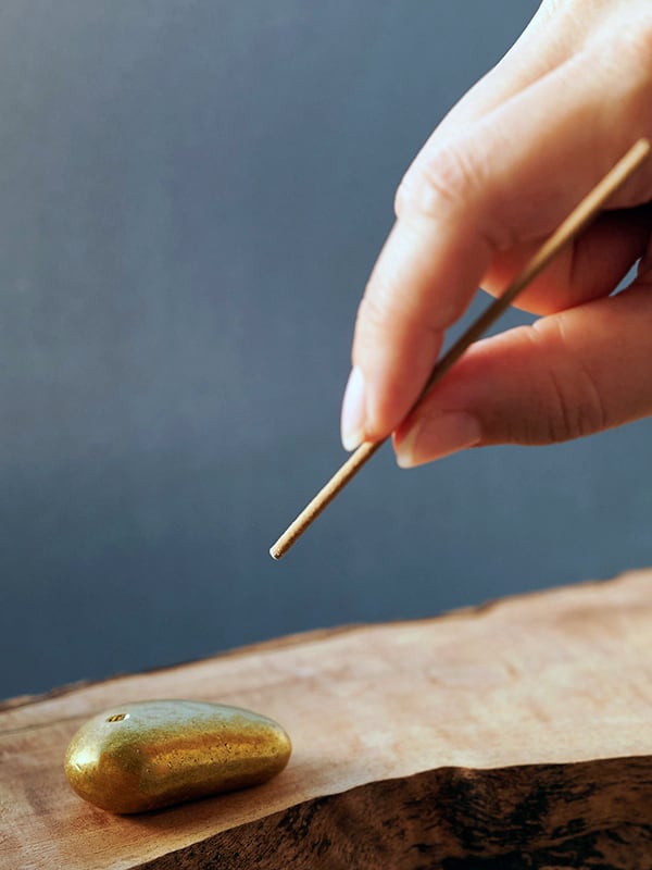 長い年月をかけて意図せず角の取れた石たちを真鍮のお香立てに仕上げました。