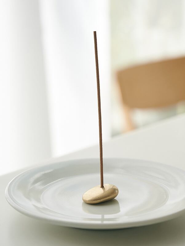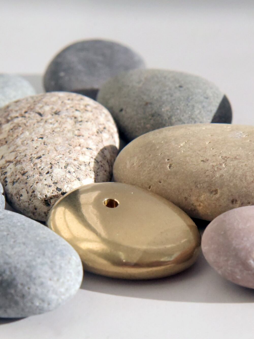 長い年月をかけて意図せず角の取れた石たちを真鍮のお香立てに仕上げました。