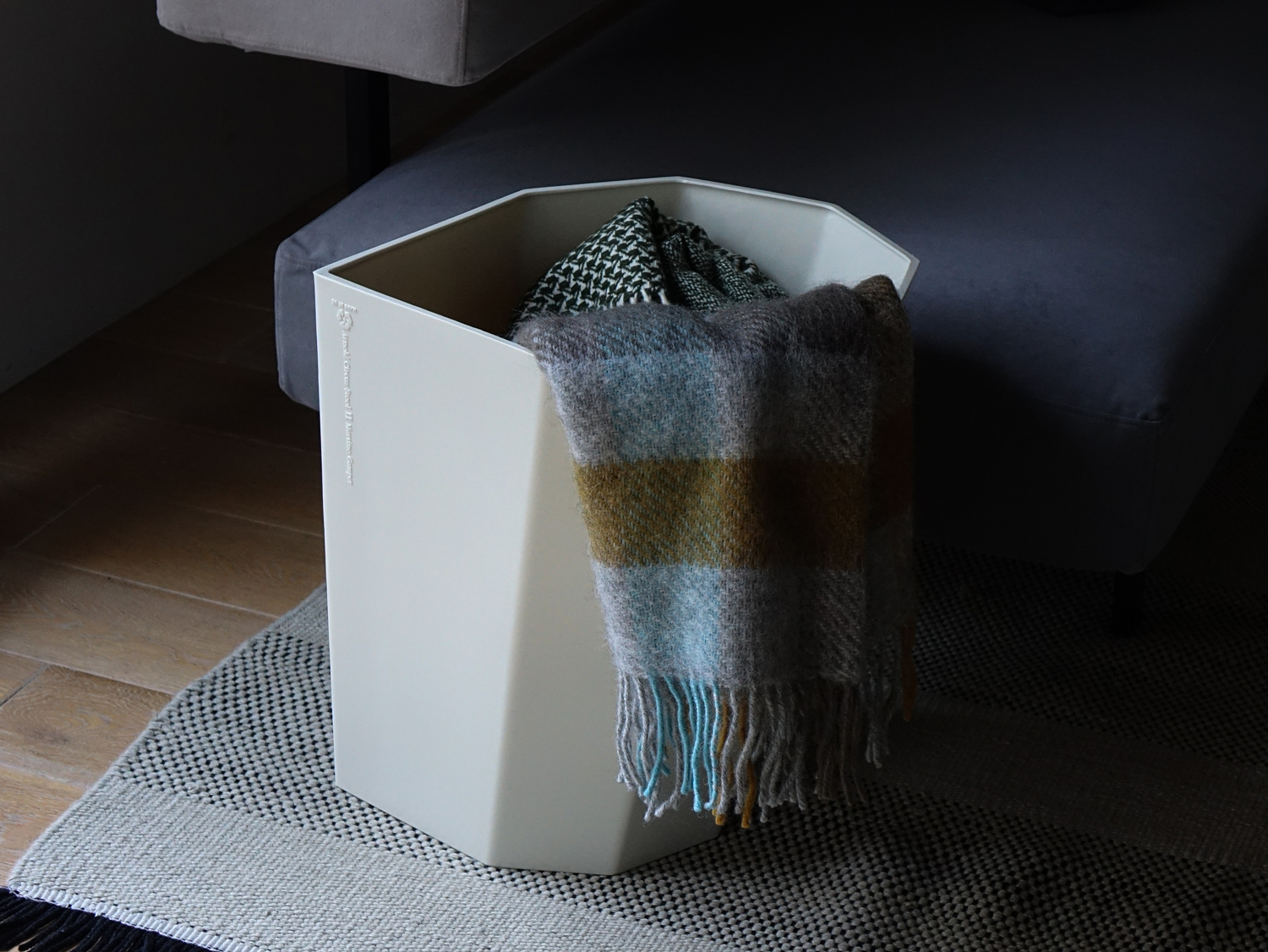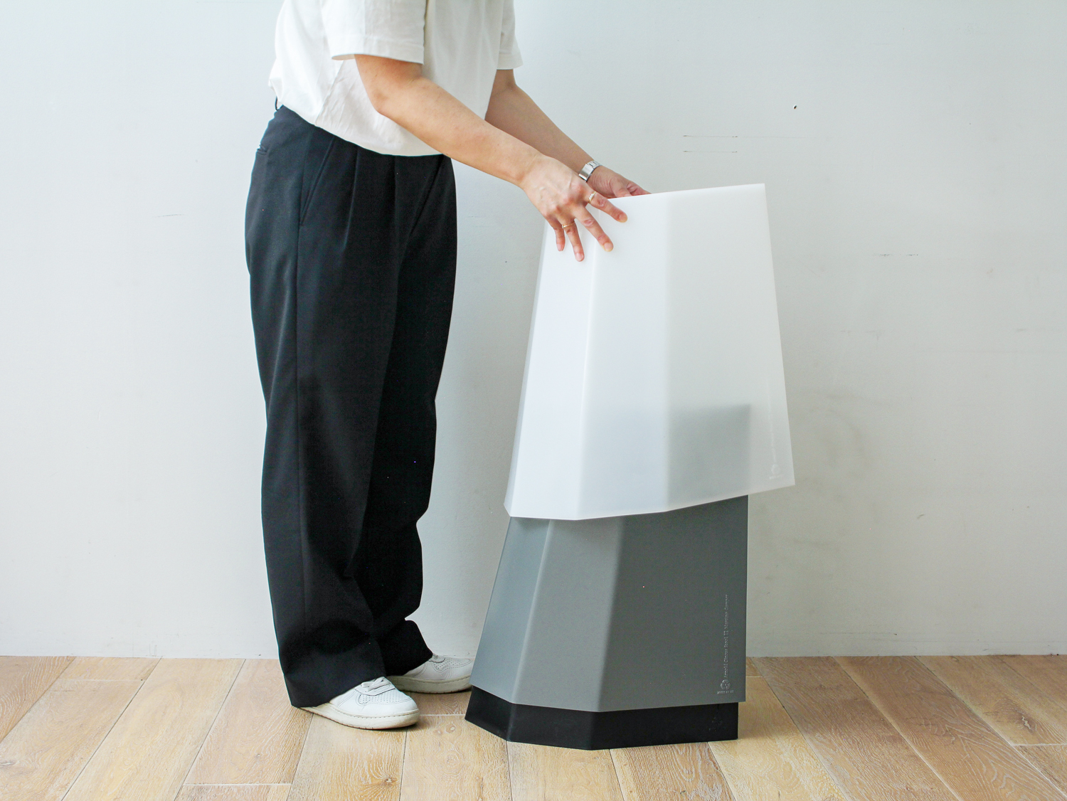 スツールの側面には刻印が入っています。 軽くて耐久性があり、お手入れのしやすい素材です。