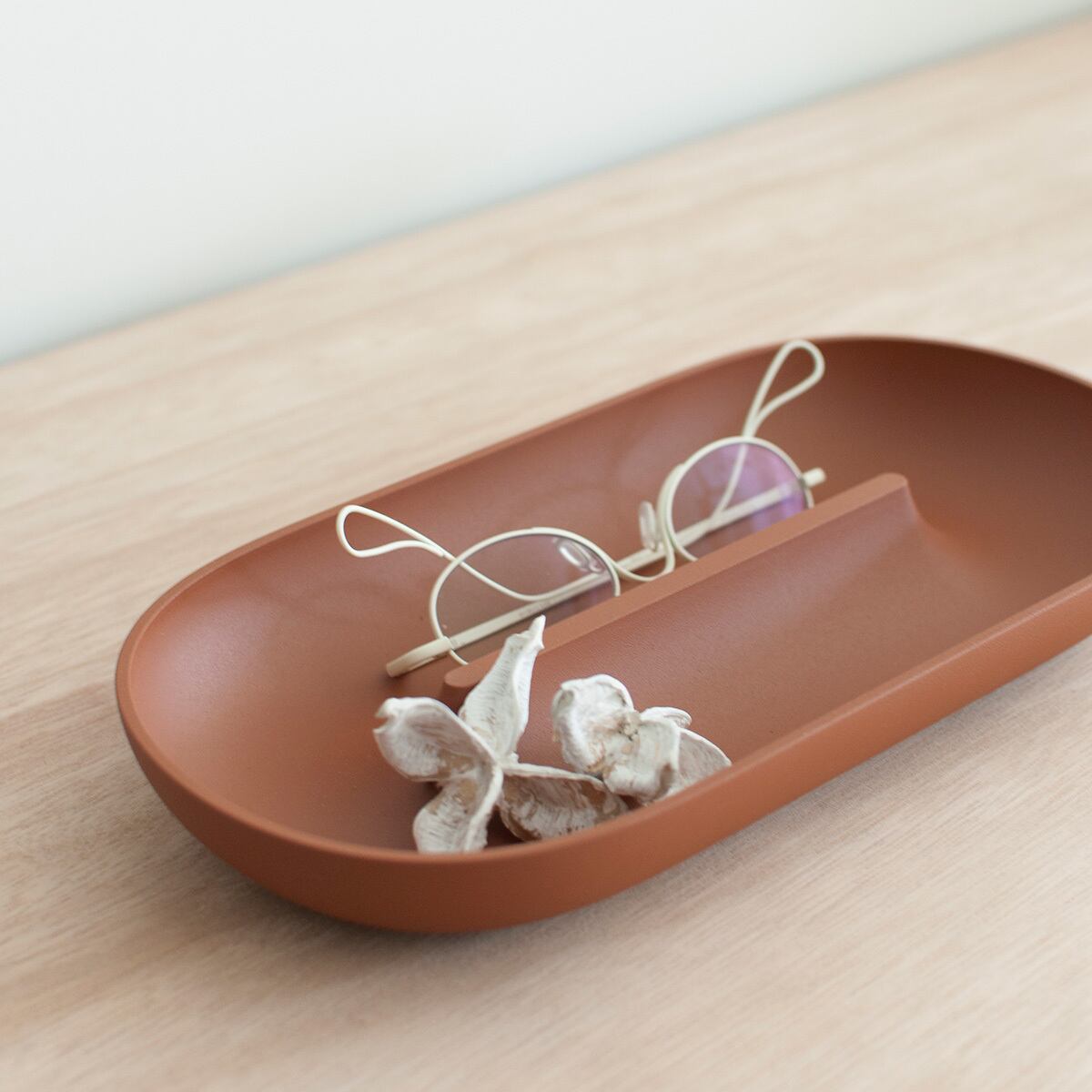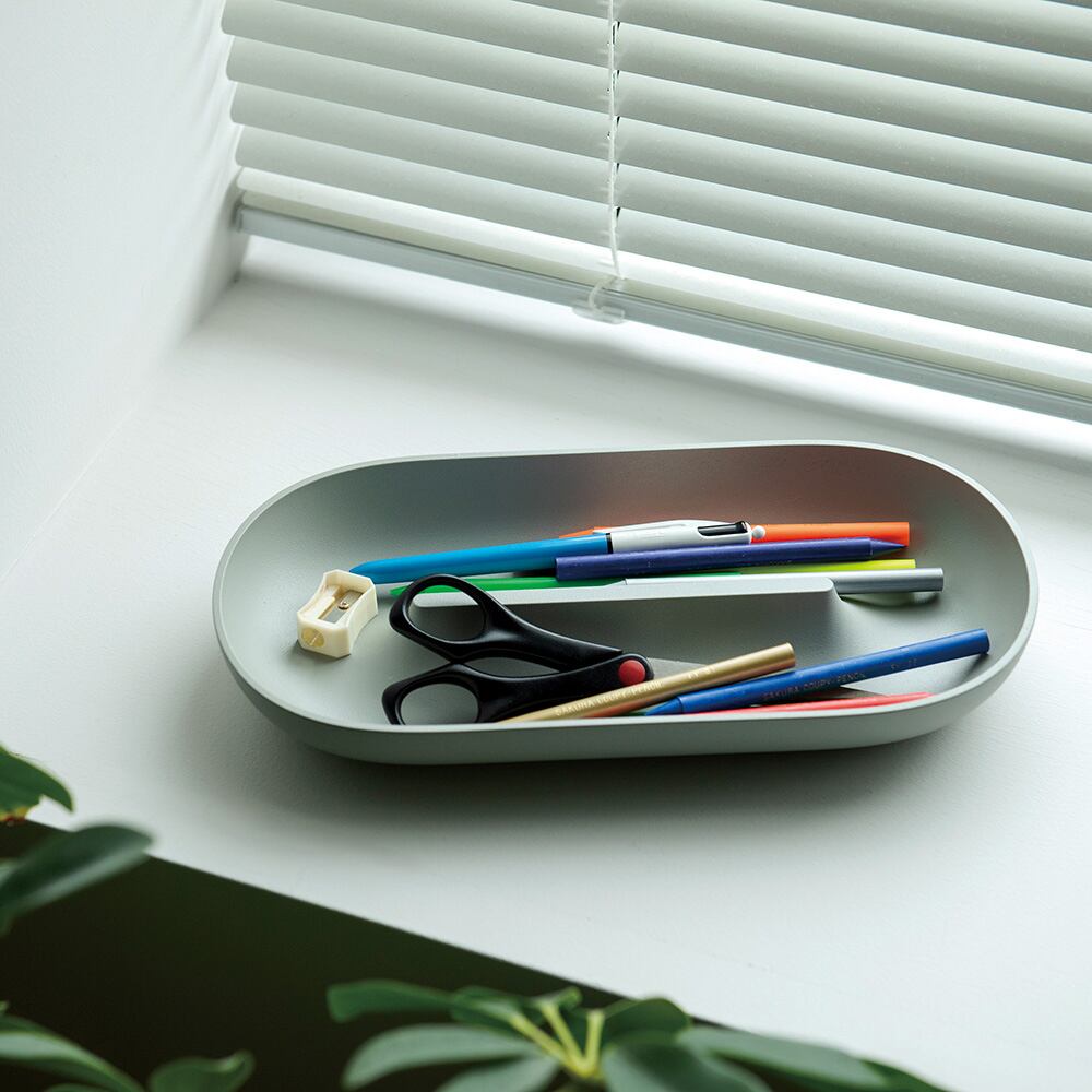デスク周りに置いて、散らばる文房具やメガネをすっきりと受け止めてもらったり。