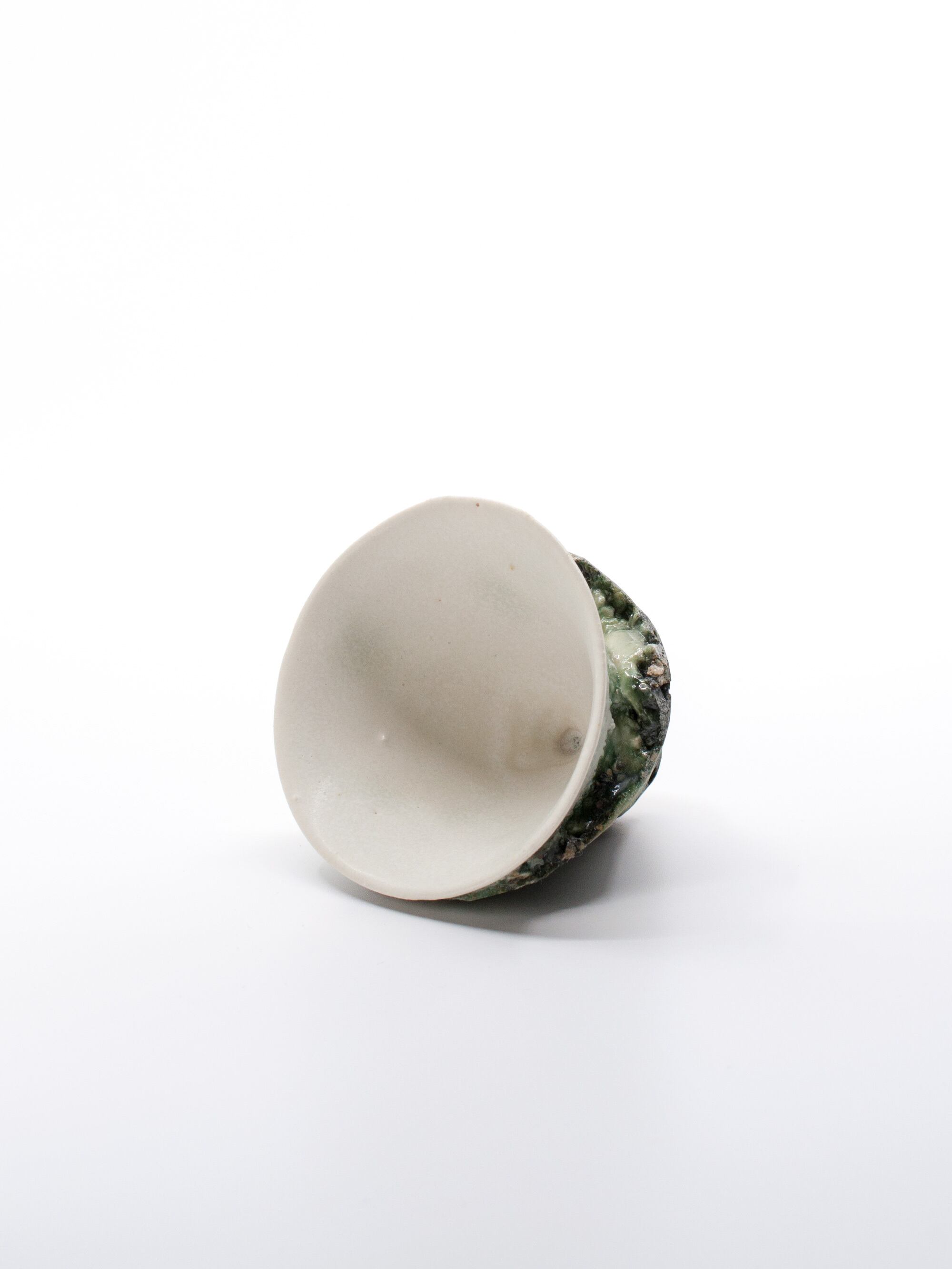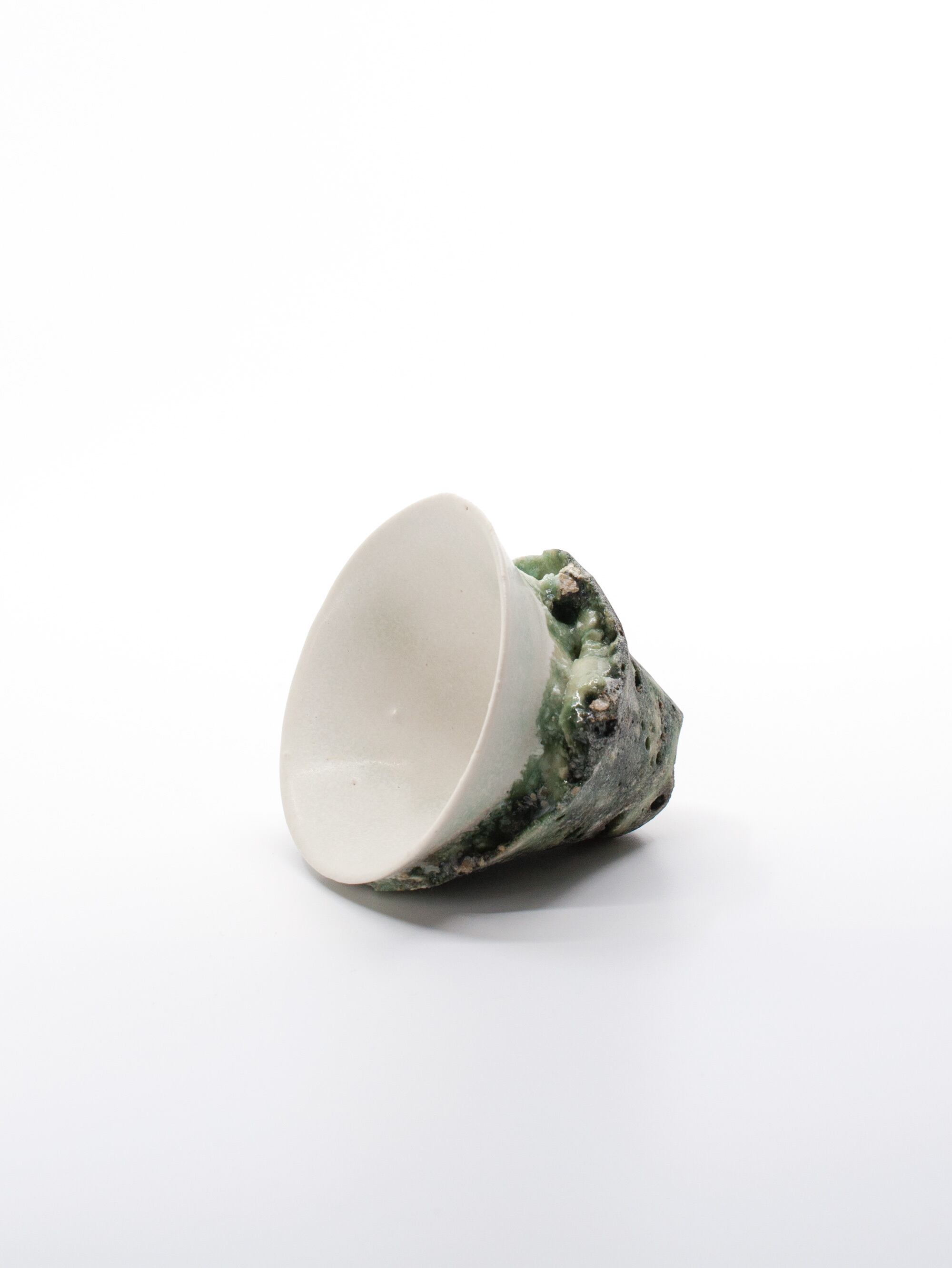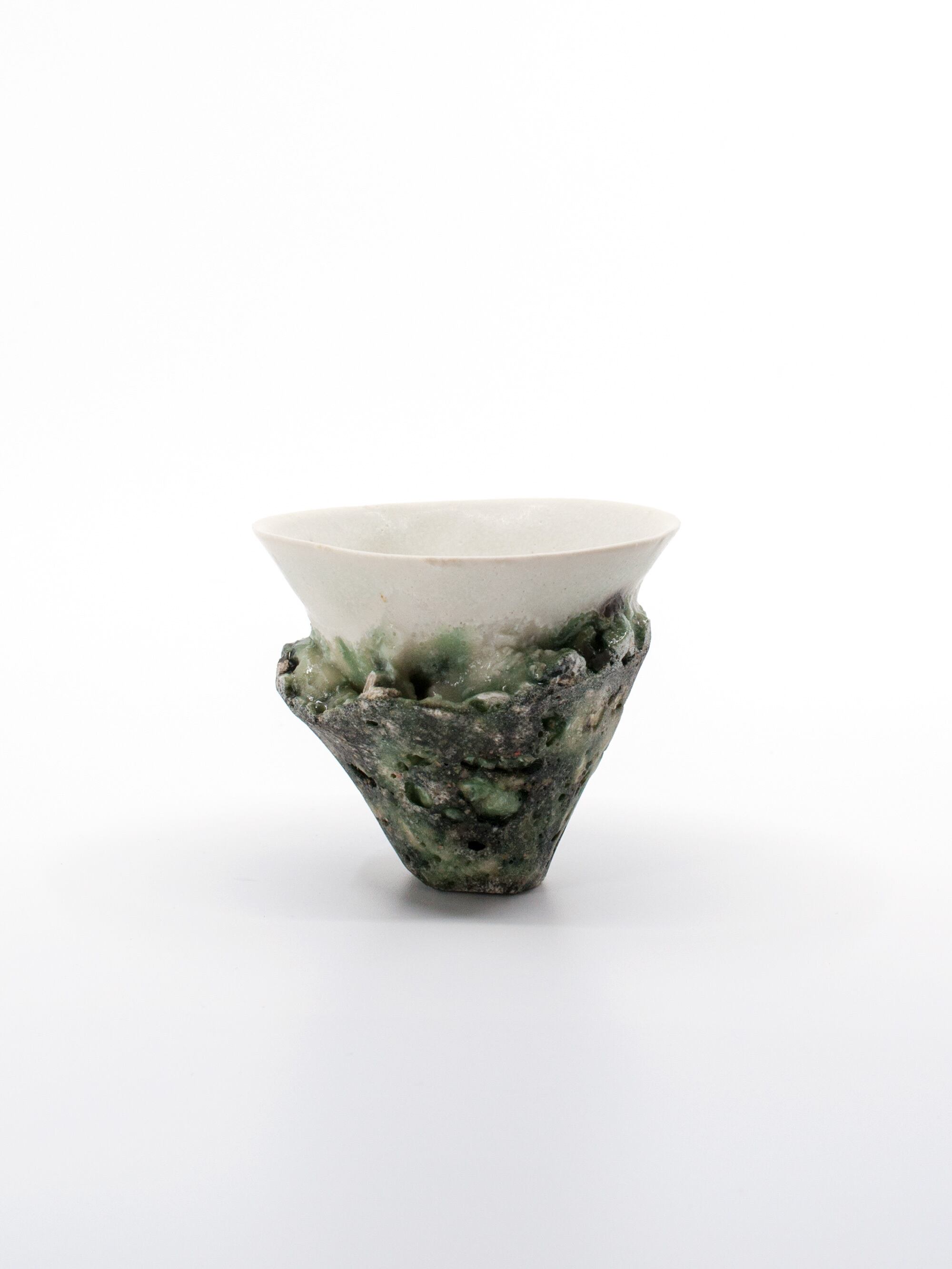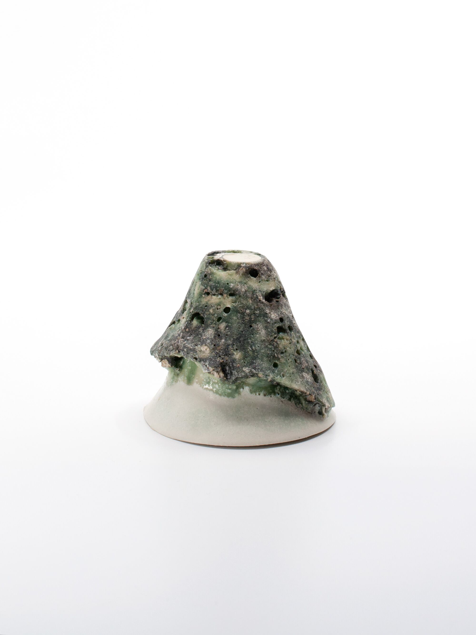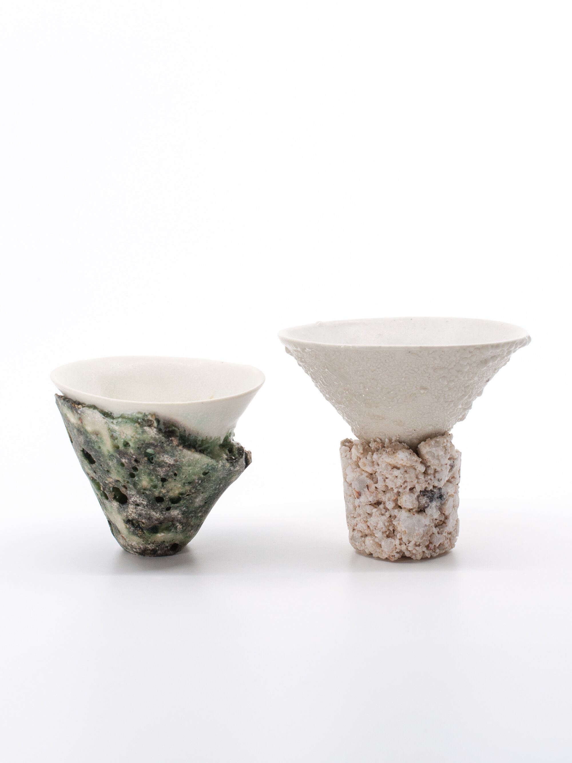 半磁器の酒器を芯材として、そのまわりを耐火粘土で覆い、その間に粘土の原石や溶ける粘土、釉薬を詰め焼成しています。